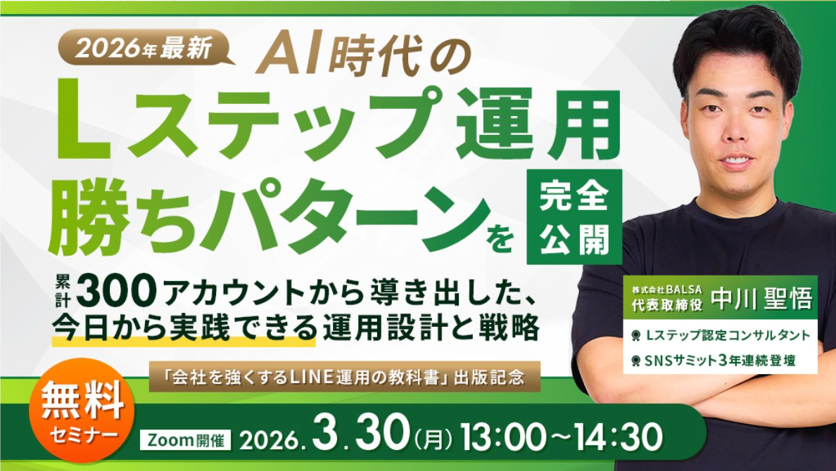2026年3月30日(月)、Lステップを提供する株式会社Maneql(マネクル)様主催のオンラインセミナー『2026年最新 AI時代のLステップ運用勝ちパターンを完全公開』に、弊社代表の中川聖悟が登壇しました。